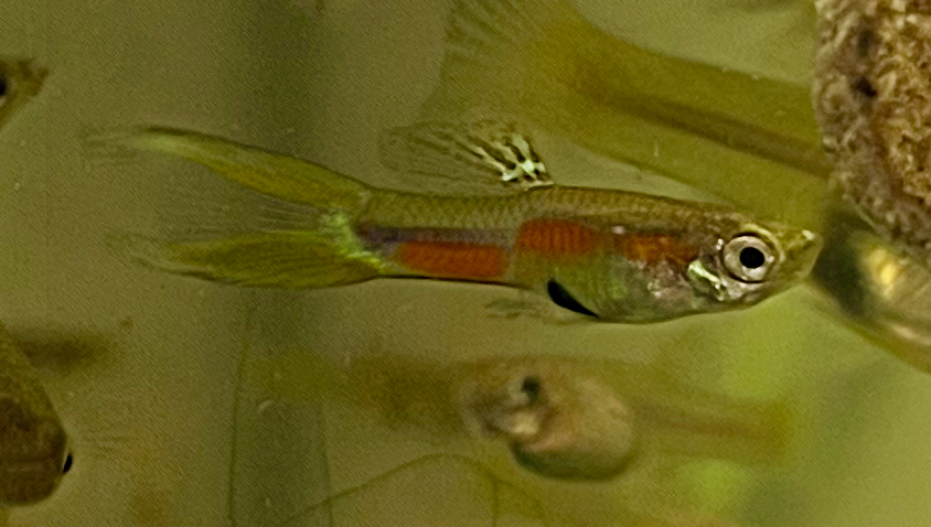 Now in January 2022, the red content is much bigger and most of the males now have a double sword tail (well, at least some color at the top and the bottom) and look like this.